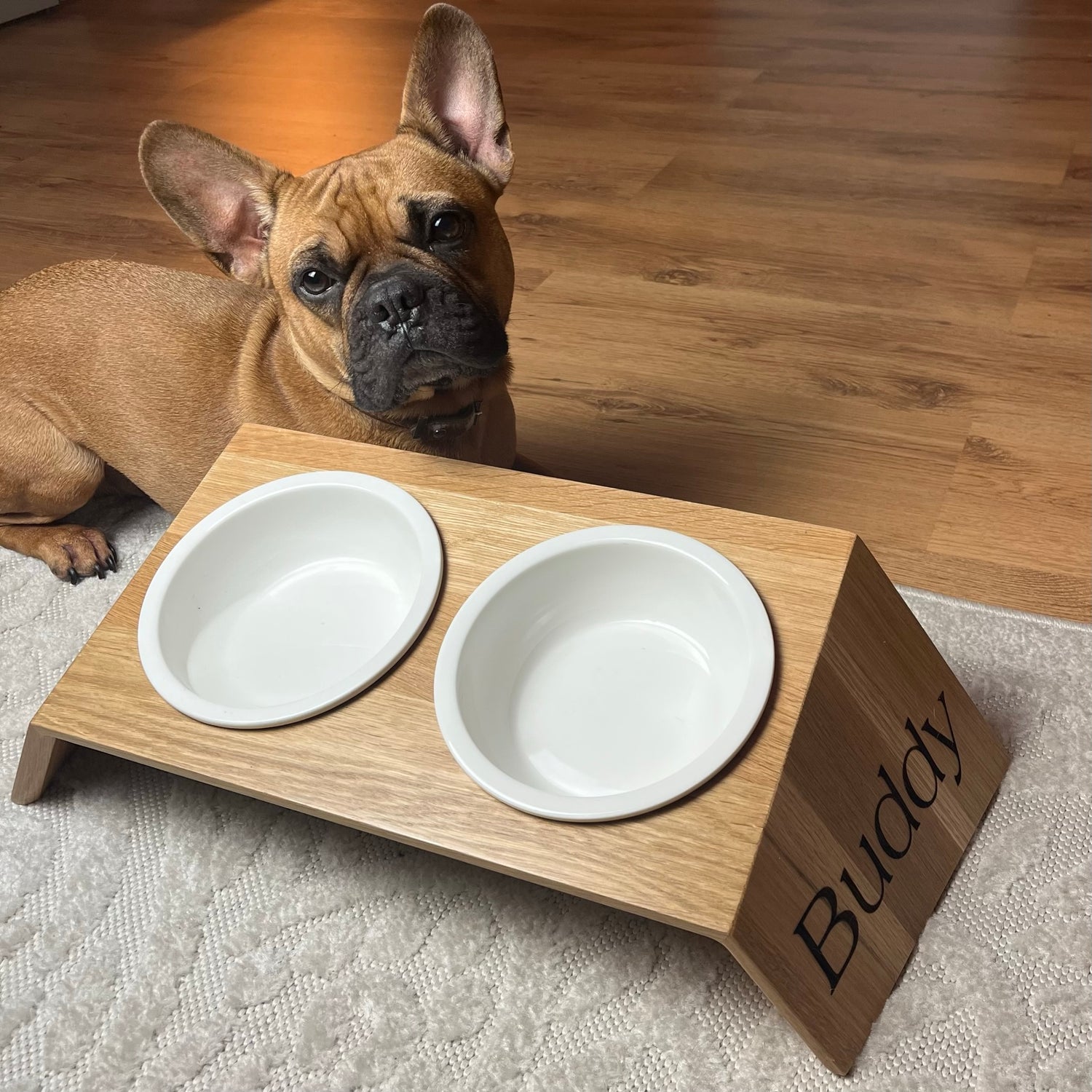 Unser personalisierter Futternapf aus Massivholz ist nicht nur ein absoluter Blickfang, sondern auch leicht abwischbar und ergonomisch. Durch die Gumminoppen hat er einen perfekten Stand und die hochwertigen Keramikschüsseln sind sogar spülmaschinengeeignet. Wir sind gespannt auf den Namen deines Lieblings und freuen uns schon darauf.